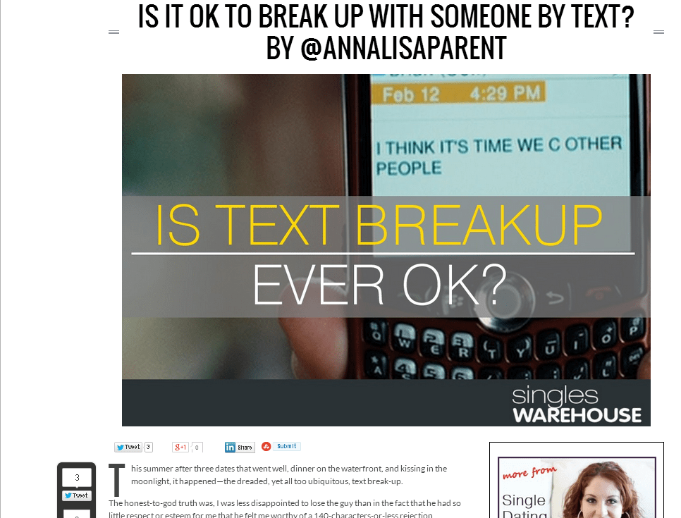 1. Breaking up by text is better than dumping someone by abruptly cutting off contact! That’s happened to me and I’ve come to find out that I’m not alone. Some closure would have been nice, if he’d just said goodbye and explained that it wasn’t working or something. I guess I’m better off without him. That probably speaks to his character. However, I still think about it after a number of years of marriage to a great guy who deserves me.